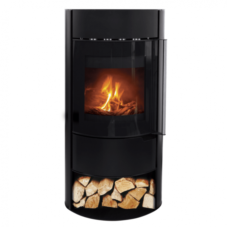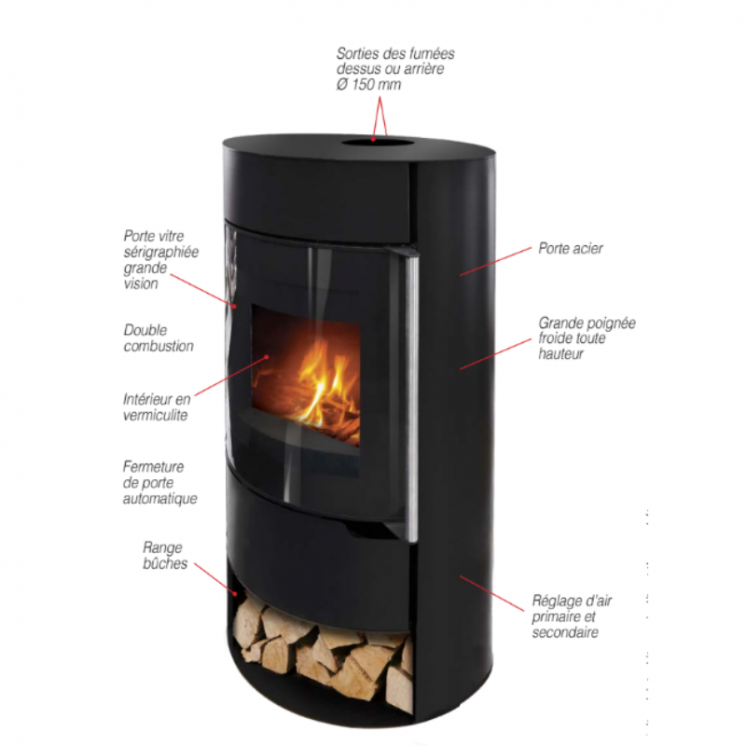 Il est équipé d’une grande poignée froide toute hauteur (confort d’utilisation) à fermeture automatique ainsi que d’un range bûches.