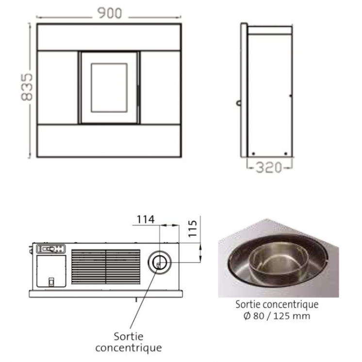 La sortie concentrique sur le dessus de diamètre 80/125 mm permet de mettre le poêle contre le mur (avec un mur anti feu ou plaque de protection) et assure une installation parfaitement esthétique.